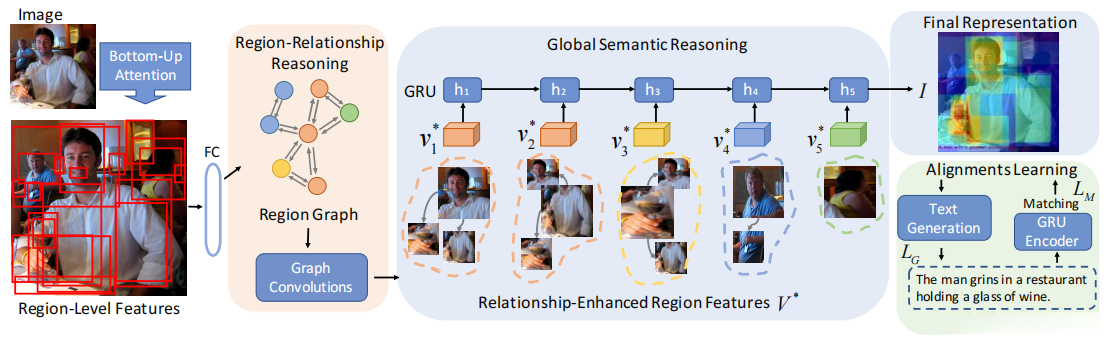考虑到当前图文匹配缺少图像全局语义概念(就像文中标题一样),作者提出首先建立图像区域之间的联系,再使用图卷积网络进行推理,生成具有语义关系的特征。随后使用门和记忆机制对这些关系增强的特征进行全局予以推理,选择有区别的信息并逐步生成全局场景表示