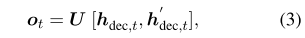 其中 φ emb(·)表示单词嵌入矩阵。 LSTM还用于通过解码器隐藏状态( h dec,1, h dec,2,…, h dec,t)重复预测输出( y 1, y 2,…, y t-1)。对于 y t的生成,模型首先在编码表示 H 上计算对话历史的专注表示 h ’dec,t 。然后,通过 U 将 h dec,t和 h ’dec,t的级联投影到词汇空间V中: