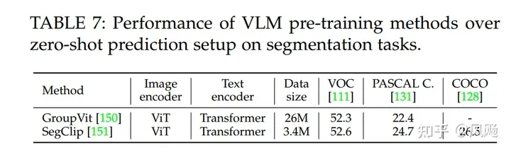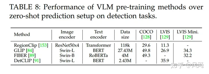 一些视觉语言模型(VLM)采用基于本地预训练设置的方法(如基于区域-词匹配策略),用于对视觉语言模型进行目标检测与语义分割相关的预训练工作。通过查看以下表格可以看出,在这两个任务上视觉语言模型能够达到预期的零样本预测效果。值得注意的是,并非所有模型都能完全符合分类任务中提出的‘数据量越多效果越佳、参数规模越大效果越佳’这一普遍规律。我们有理由期待,在这一领域持续深入的研究探索下,“数据越多效果越好、模型越大效果越好”的趋势将会逐步显现出来。