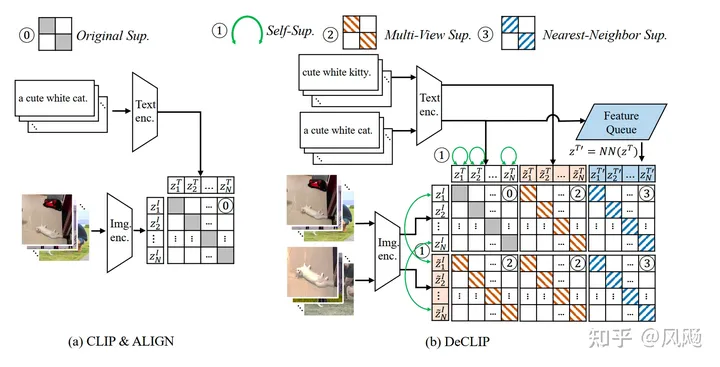 - [Li, Yangguang, et al. "Supervision exists everywhere: A data efficient contrastive language-image pre-training paradigm." arXiv preprint arXiv:2110.05208 (2021).](https://link.zhihu.com/?target=https%3A//arxiv.org/abs/2110.05208 "Li, Yangguang, et al. "Supervision exists everywhere: A data efficient contrastive language-image pre-training paradigm." arXiv preprint arXiv:2110.05208 2021.") (DeCLIP)