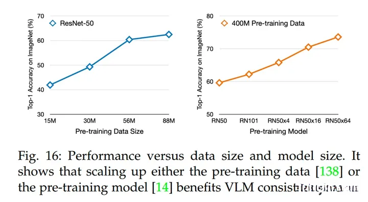 - 大模型——相对于传统的视觉识别模型而言,在VLM中通常采用了拥有更大参数规模(例如COCA中的ViT-G架构包含2B个可训练参数)的模型;这些架构具备强大的计算能力以实现从大数据中有效的学习;