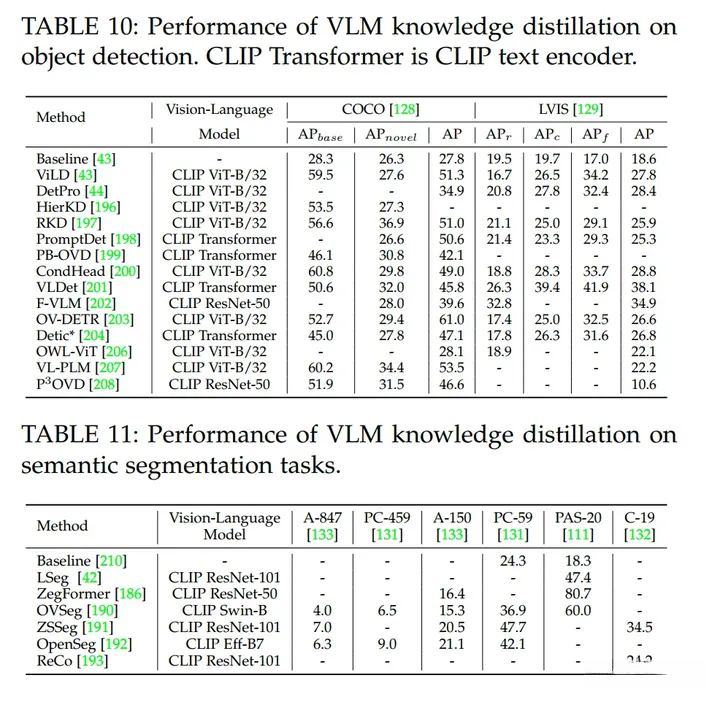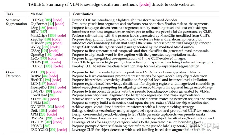 基于VLMs具备捕捉广泛视觉与文本概念间普遍关联的能力,一些研究致力于从这些模型中提取这种普遍且可靠的知识,以便解决诸如目标检测与语义分割等复杂的密集预测任务。值得注意的是,通过蒸馏技术,VLM的知识得以被提取到专为特定任务设计的模型中,不受特定于VLM架构的影响,从而在多种密集预测场景下,有助于提升特定任务的表现水平。以下是一些应用基于蒸馏技术从通用知识库抽取特征用于语义分割及目标检测的具体案例。