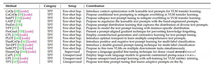 按照基于Prompt调参视角的主要方法类型的不同,目前的方法主要可分为文本调参、视觉调参以及文本与视觉调参三种形式;从监督学习的角度来看,则主要可分为监督转移学习、基于少样本的监督转移学习以及无监督迁移学习三种类型。