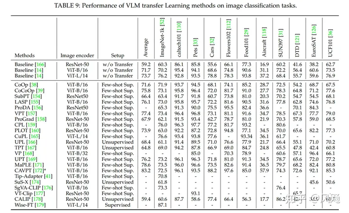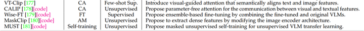 - 无监督VLM迁移。大多数现有的VLM迁移研究均基于有标签或少量标签的情境展开,并依赖于大量标注数据获取这一过程可能会导致模型过拟合现象的发生。相比之下,在探索大规模未标注数据集时采用无监督学习方法可有效降低这种过拟合风险,并为未来的研究提供新的方向。
