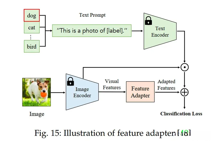 通过微调输入的prompt(涵盖文本与图像)来优化性能的同时,在Feature Adaption方法中引入了一个便捷插件式组件以优化特征提取效率。如图所示的架构是一个典型的实例,在该方案中采用多层感知机等网络结构来适配下游任务需求,并在基础架构上附加残差连接设计以确保在零样本任务中仍能保持良好性能。这类方法的主要代表包括Clip-Adapter、Tip-Adapter以及SVL-Adapter等系列模型。