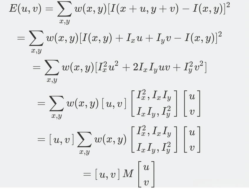 E(u, v)=\sum_{x, y} w(x, y)[I(x+u, y+v)-I(x, y)]^{2}