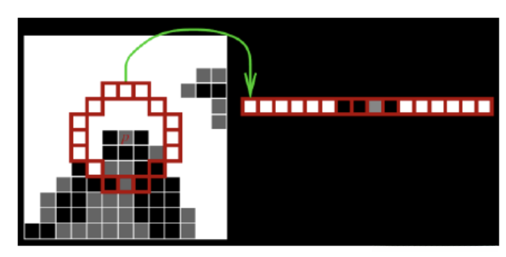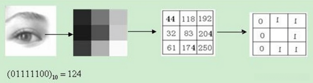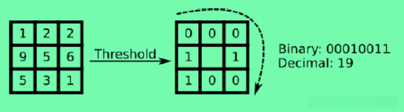 原始LBP特征 :在3∗3的窗口内,以窗口中心像素为阈值,将相邻的8个像素的灰度值与其进行比较,若周围像素值大于中心像素值,则该像素点的位置被标记为1,否则为0。这样,3∗3邻域内的8个点经比较可产生8位二进制数,即LBP值。