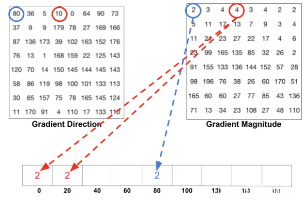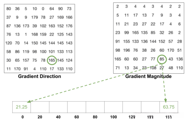 我们将上一步得到的梯度方向投影到9个通道中,并将梯度幅值作为投影时的权值。