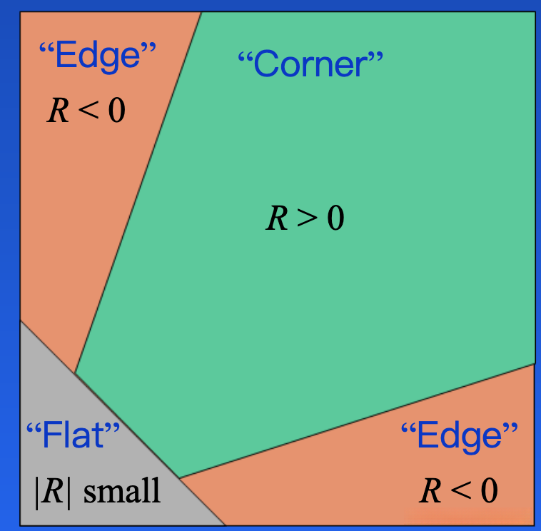 Harris给出的角点计算方法并不需要计算具体的特征值,而是计算一个角点响应值R来判断角点。R的计算公式为: