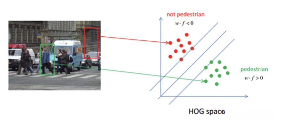 从上图中,我们可以发现直方图的主要方向捕捉了人的外形,尤其是躯干和腿的部位。我们得到归一化的HOG特征之后,就可以使用分类器对行人进行检测,比如使用支持向量机SVM进行人与背景的分类,如下图所示: