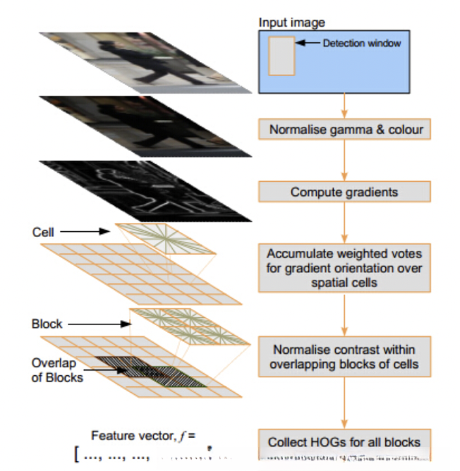 颜色空间归一化— >梯度计算—>梯度方向直方图—>重叠块直方图归一化—>HOG特征