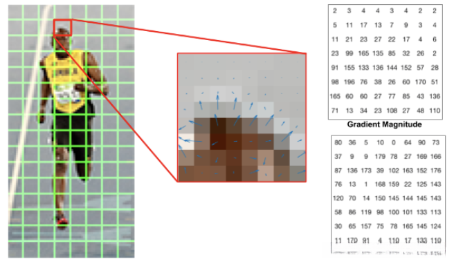 - 梯度方向直方图:将图像划分成小cells(例如8*8像素/cell), 统计每个cell的梯度直方图(不同梯度的个数),即可形成每个cell的描述符