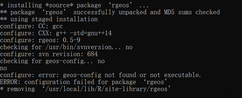 6.q()退出R,回到终端。依然一行代码解决。当然你也可以自行去下载(wget http://download.osgeo.org/geos/geos-3.9.3.tar.bz2)并解压,然后编译安装。