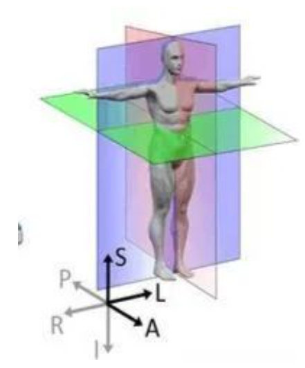 首先要明确一下和人体对应的方向,其中三个窗口对应三个切面,对应关系如下图所示,按照字母索引即可。例如,左上图对应R-A-L-P这个面,是从脚底往头部方向看的切面(即z方向),另外两张类似。