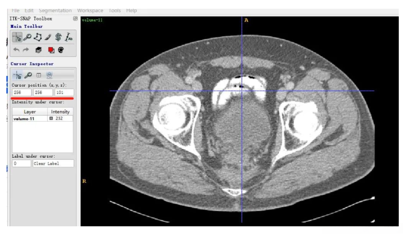 同一个slice在ITK-SNAP可视化结果(注意这里(x,y,z=(256,256,101)),因为itk-snap默认从1开始索引):
