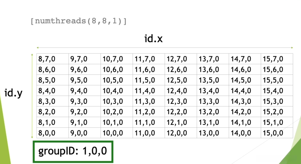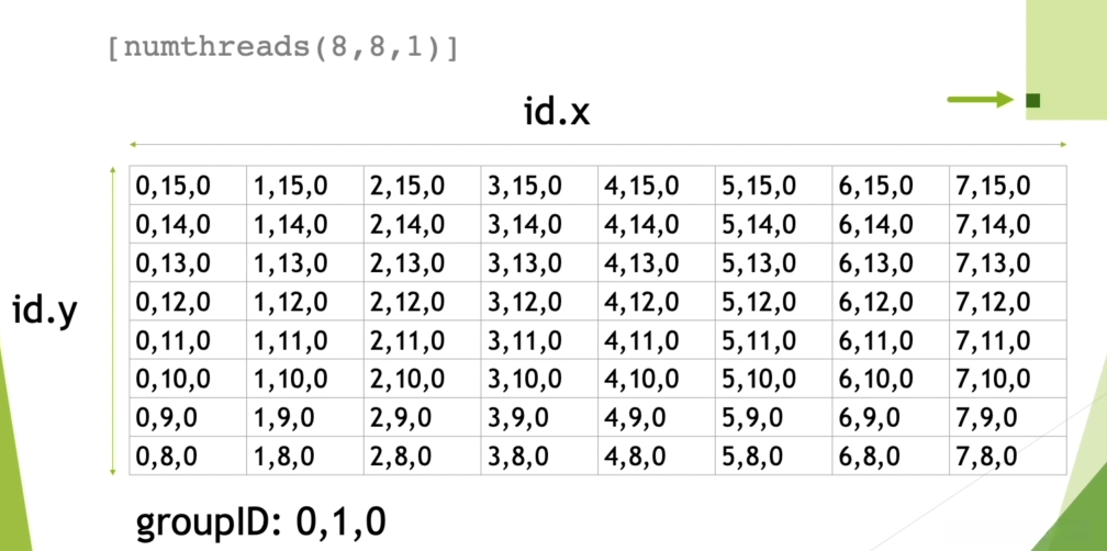 线程组ID是(0,0,0)对应的id.xy应该是下面这样的,这个时候id.x和y指向纹理的左下角,多线程在左下角处理一个8*8的像素