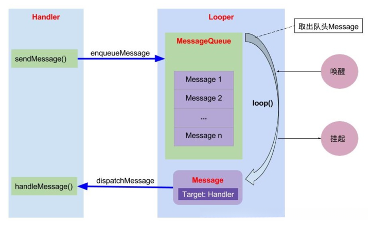 消息(Message):待传输的信息中包含着标识信息、处理对象以及相关信息等,由MessageQueue统一管理后将这些信息发送至Handler进行接收并执行。