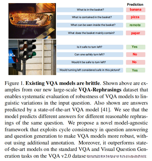 图1。现有的VQA模型很脆弱。上面所示的例子来自我们新的大规模VQA改写数据集,该数据集能够系统地评估VQA模型对输入问题中语言变化的稳健性。还显示了由最先进的VQA模型预测的答案。我们看到,对于同一个问题的不同合理表述,模型预测了不同的答案。我们提出了一个新的模型不可知框架,该框架利用问答和问题生成中的循环一致性,使VQA模型更加健壮,而不需要使用额外的注释。此外,它在标准VQA和VQA v2.0数据集上的可视化问题生成任务上都优于最先进的模型。