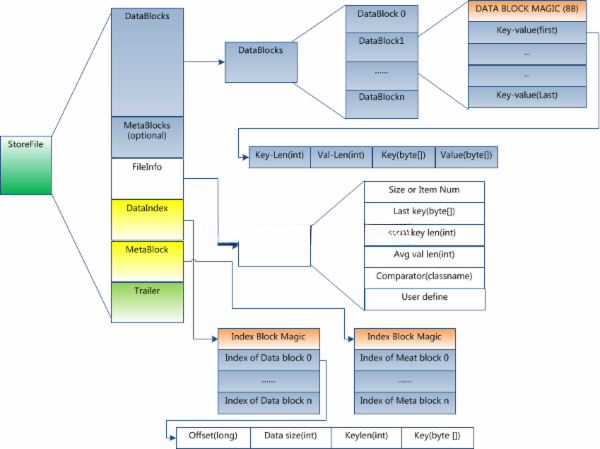 虽然Region被视为分布式存储中的最小单元之一,但它并非数据存储的基本单位。Region由一个或多个Stor构成,每一个store都负责管理特定的数据族。每一个store进一步包含了一个memStor以及零个或多个StorFile。每个StorFile中包含有相应的HDFile,而memStor则存放在内存中,剩余的StorFile则储存在HDFS上。