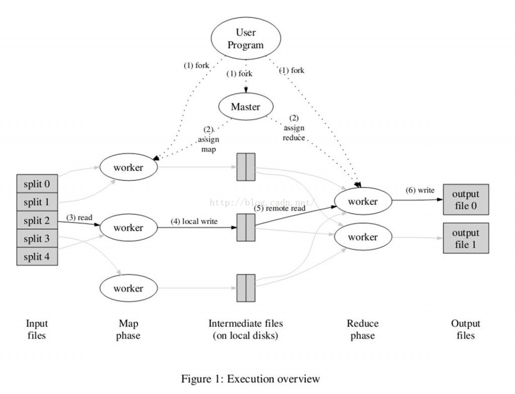 我认为将流程划分为三个阶段更为合理。第一个阶段主要进行准备工作,具体包括第1步与第2步的操作内容;第二个阶段则涉及第3步至第6步的任务安排;第三个阶段主要是收尾工作,在此期间系统会整合所有作业结果并将其存入指定的输出文件中。在第一个阶段中负责数据拆分与复制用户的程序任务的是MapReduce核心组件;而第二个阶段则由自定义的映射与归约函数主导执行过程;第三个阶段则主要负责整合并处理最终结果的相关操作