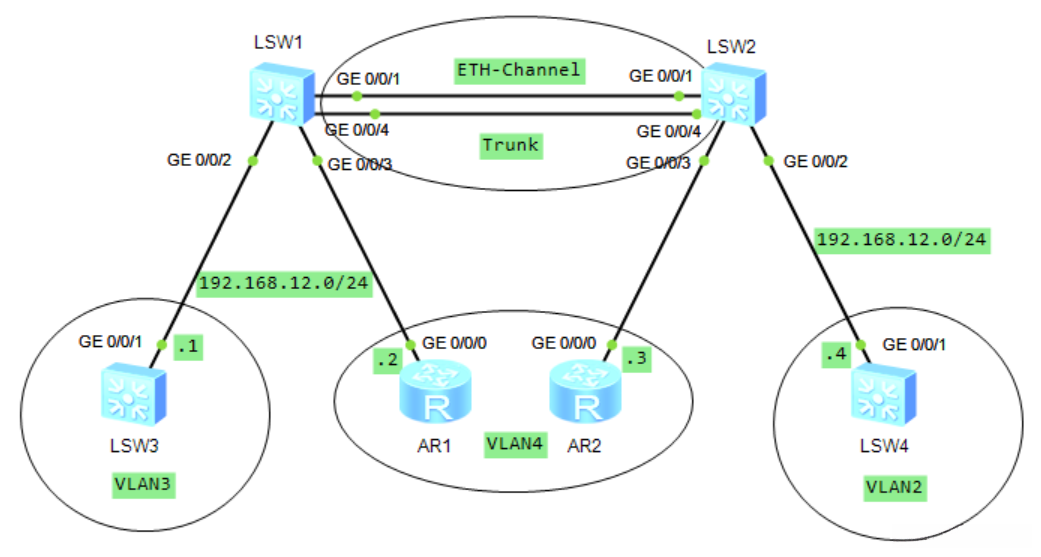 本实验中,交换机S3、S4,路由器R1、R2作为客户端,在S1、S2上分别创建VLAN2、3、4,并使用两种不同的方式将端口加入VLAN中,将所有连接客户端的端口类型配置为Access: