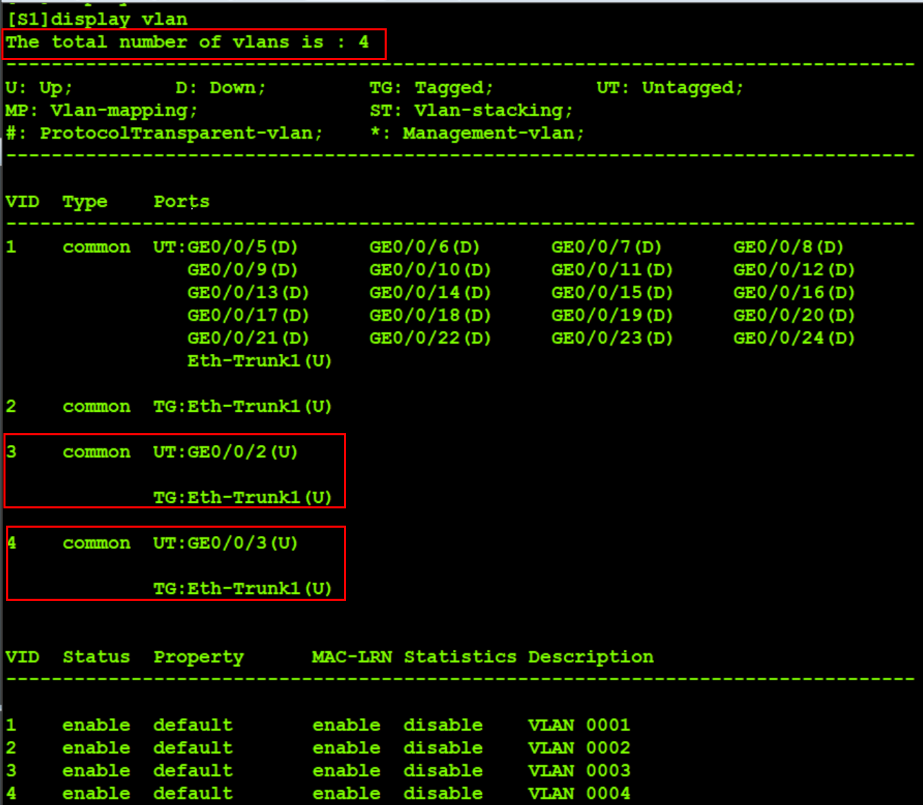 [S2-Eth-Trunk1]port trunk allow-pass vlan all
