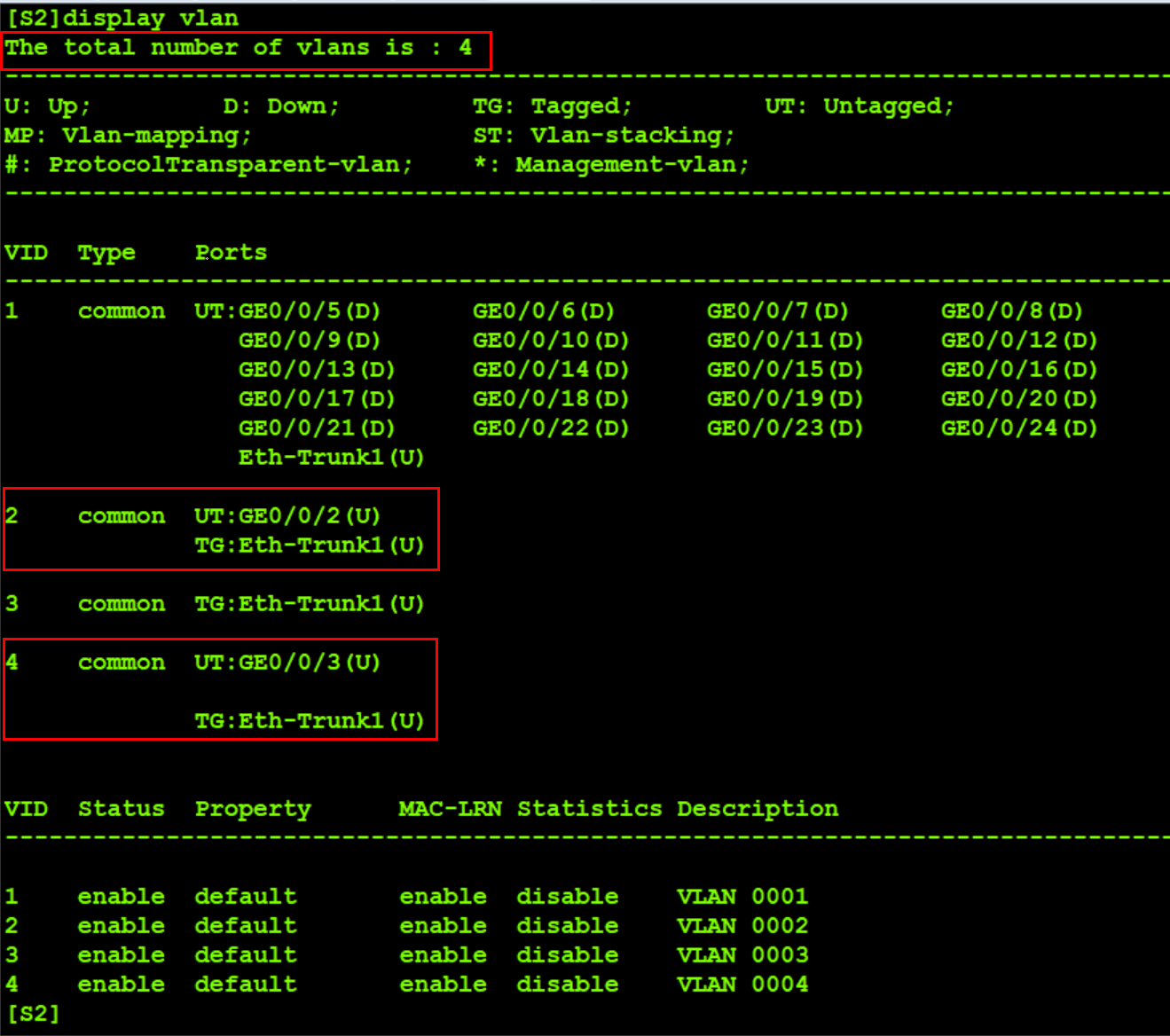 [S2-GigabitEthernet0/0/3]port default vlan 4