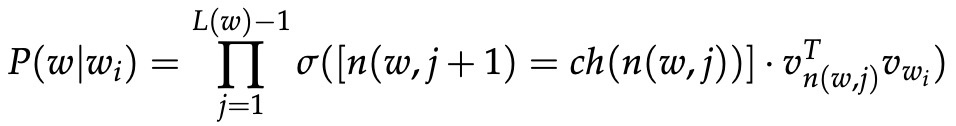 。 所以 n(w, 1) 是根,而 n(w, L(w)) 是 w 的父节点。 对于每个内部节点 n,我们任意选择它的一个子节点并将其称为 ch(n)(例如,始终是左节点)。 然后,我们可以计算概率为:
