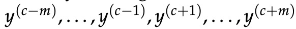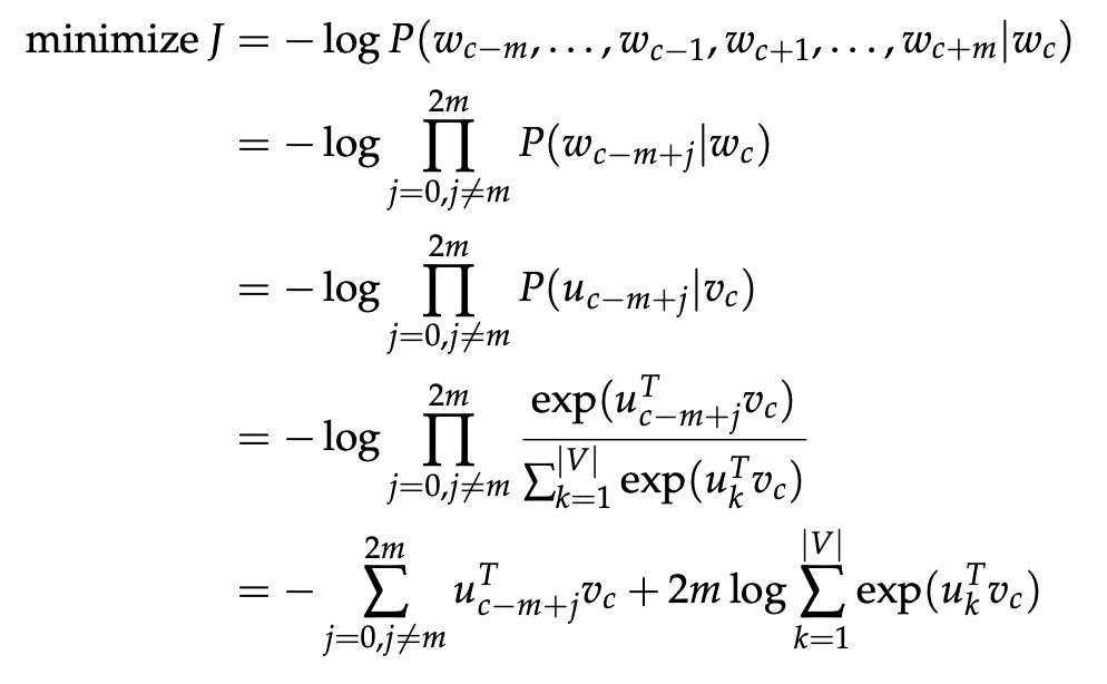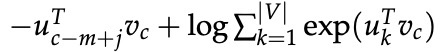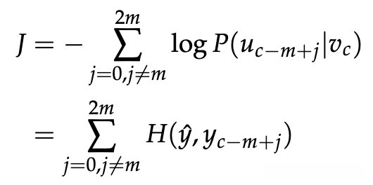 对于skip-gram,给定中心单词c,我们观察上下文单词 c − m + j 的新目标函数为: