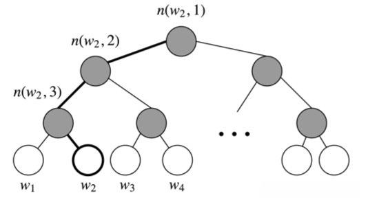 先给出一些符号,令 L(w) 为从根节点到叶节点 w 的路径的节点数。 例如,图 4 中的 L(w2) 为 3。 n(w, i) 为这条路径上的第 i 个节点,并带有关联向量