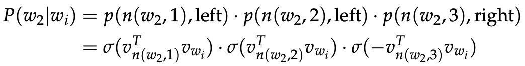 首先,我们根据从根 (n(w, 1)) 到叶子 (w) 的路径形状计算各项的乘积。 如果我们假设 ch(n) 总是 n 的左节点,那么当路径向左时,[n(w, j + 1) = ch(n(w, j))] 返回 1,如果向右则返回 -1 。