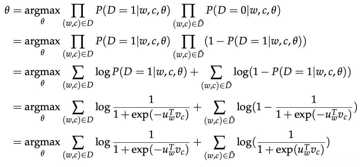 现在,我们构建了一个新的目标函数,试图最大化一个词和上下文在语料库数据中的概率,如果确实存在的话。如果确实不在语料库数据中,则最大化单词和上下文不在语料库数据中的概率。我们对这两个概率采用简单的最大似然方法。 (这里我们取 θ 作为模型的参数,在我们的例子中是
