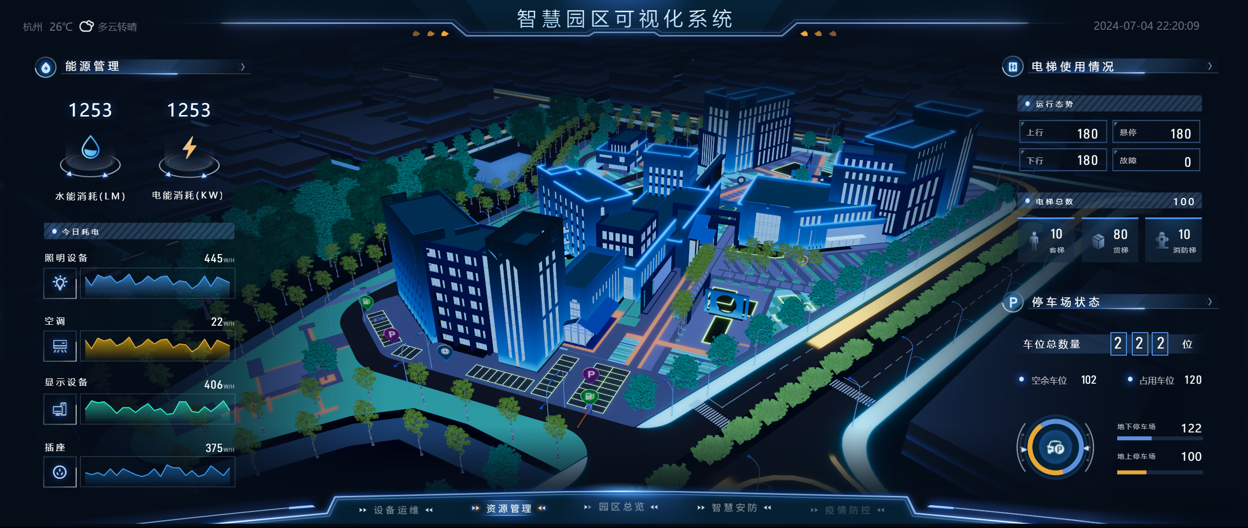 智慧园区能够显示能源消耗情况,还能具体到不同的设备,比如:照明设备,空调,显示设备,插座等。还能实时显示园区内各种资源的使用情况,如停车位、电梯。管理者可以通过大屏上的资源信息,合理调度和管理园区内的资源,提高资源利用率。