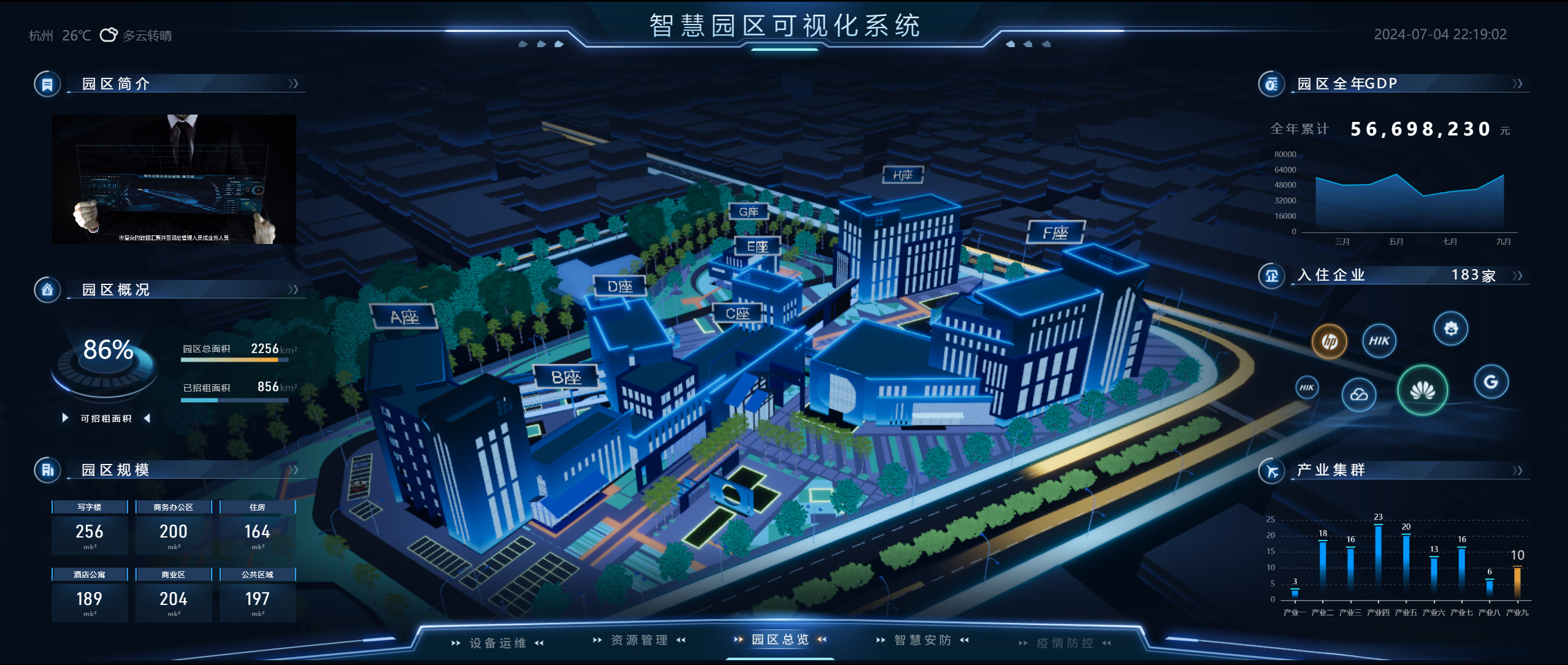 智慧园区大屏通过综合展示园区的各项数据和信息,为管理者提供全面、直观的园区概览。这包括但不限于园区的面积,规模,入驻企业数量,产业集群等关键数据。大屏上的数据和信息以图表、报表等形式直观展示,帮助管理者快速了解园区的整体运营状况。管理者可以根据大屏上的数据,及时调整管理策略,优化资源配置,提高园区的效率。