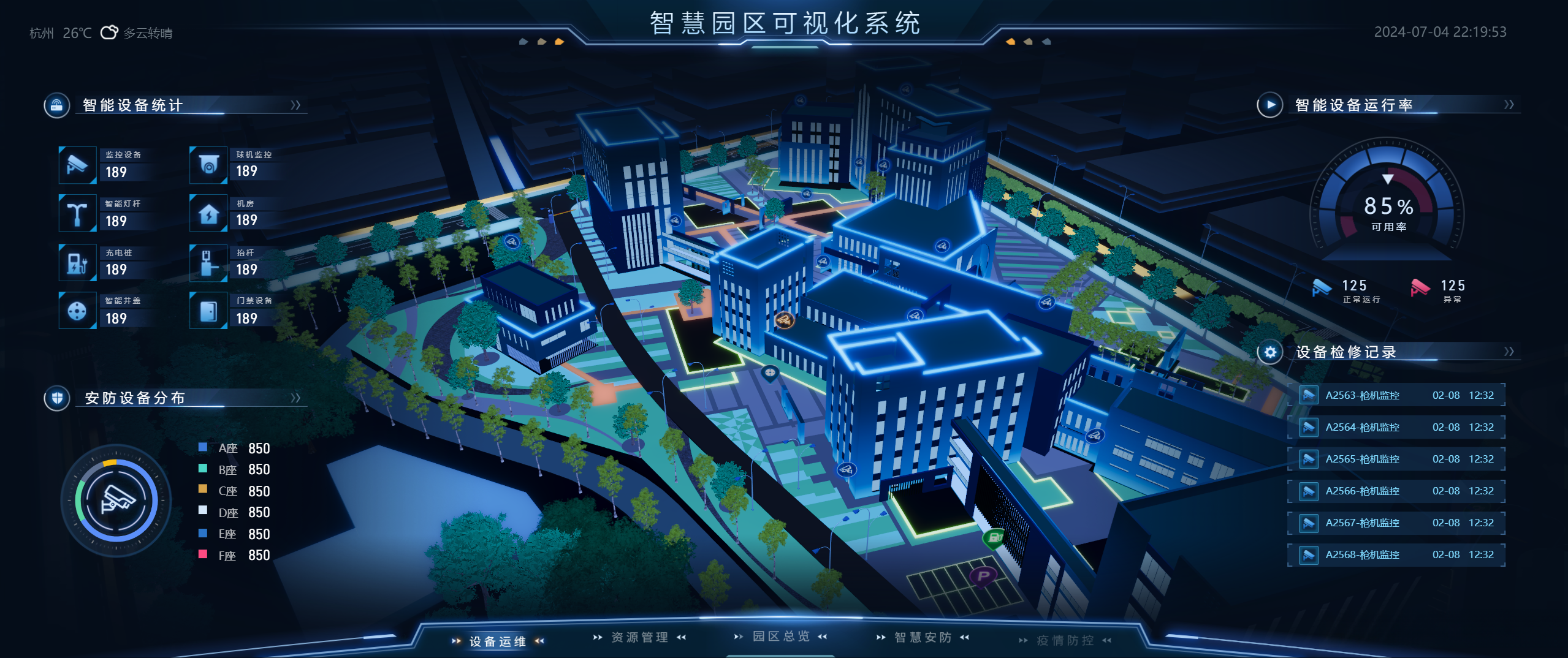 智慧园区大屏可以实时显示园区内各种设备的状态和分布数量,如监控设备,机房,充电桩,门径设备等。一旦设备出现故障或异常情况,大屏会立即发出预警信号 ,提醒管理者及时采取措施,并且显示设备检修记录。