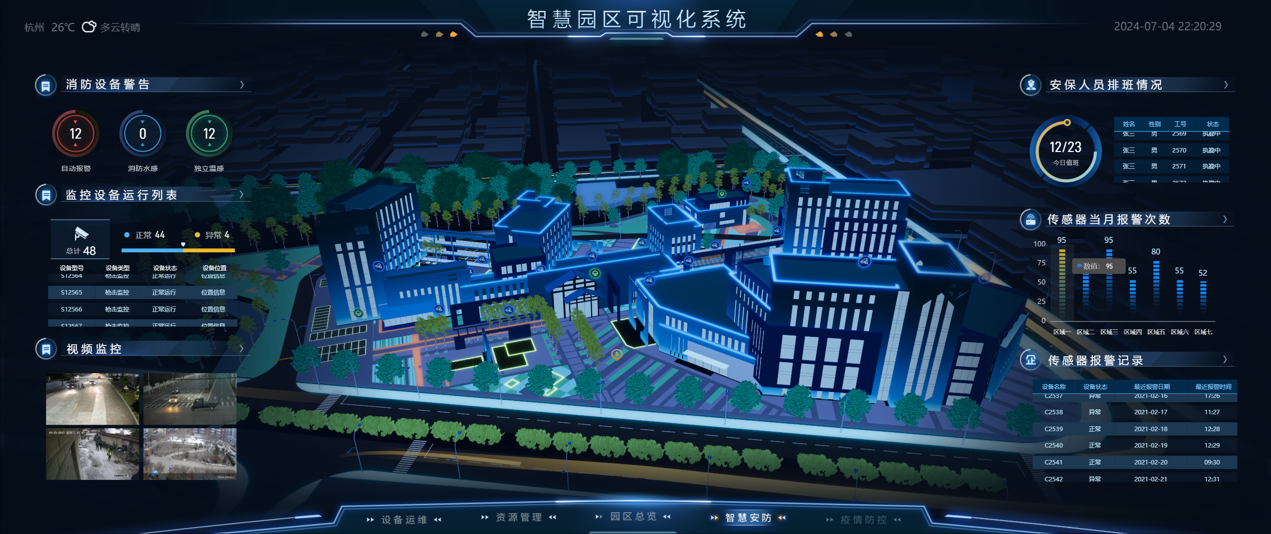 智慧园区大屏通过连接各类监控设备,实现园区内的全方位监控。一旦园区内发生异常事件,如火灾、盗窃等,智慧园区大屏会立即发出预警信号,并自动触发相应的应急响应机制,还会记录传感器报警的具体时间等。