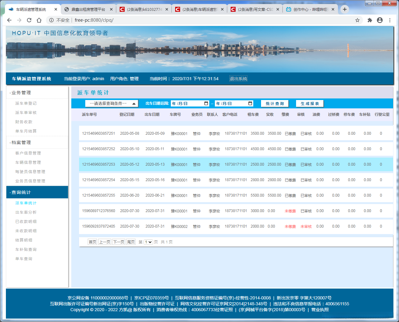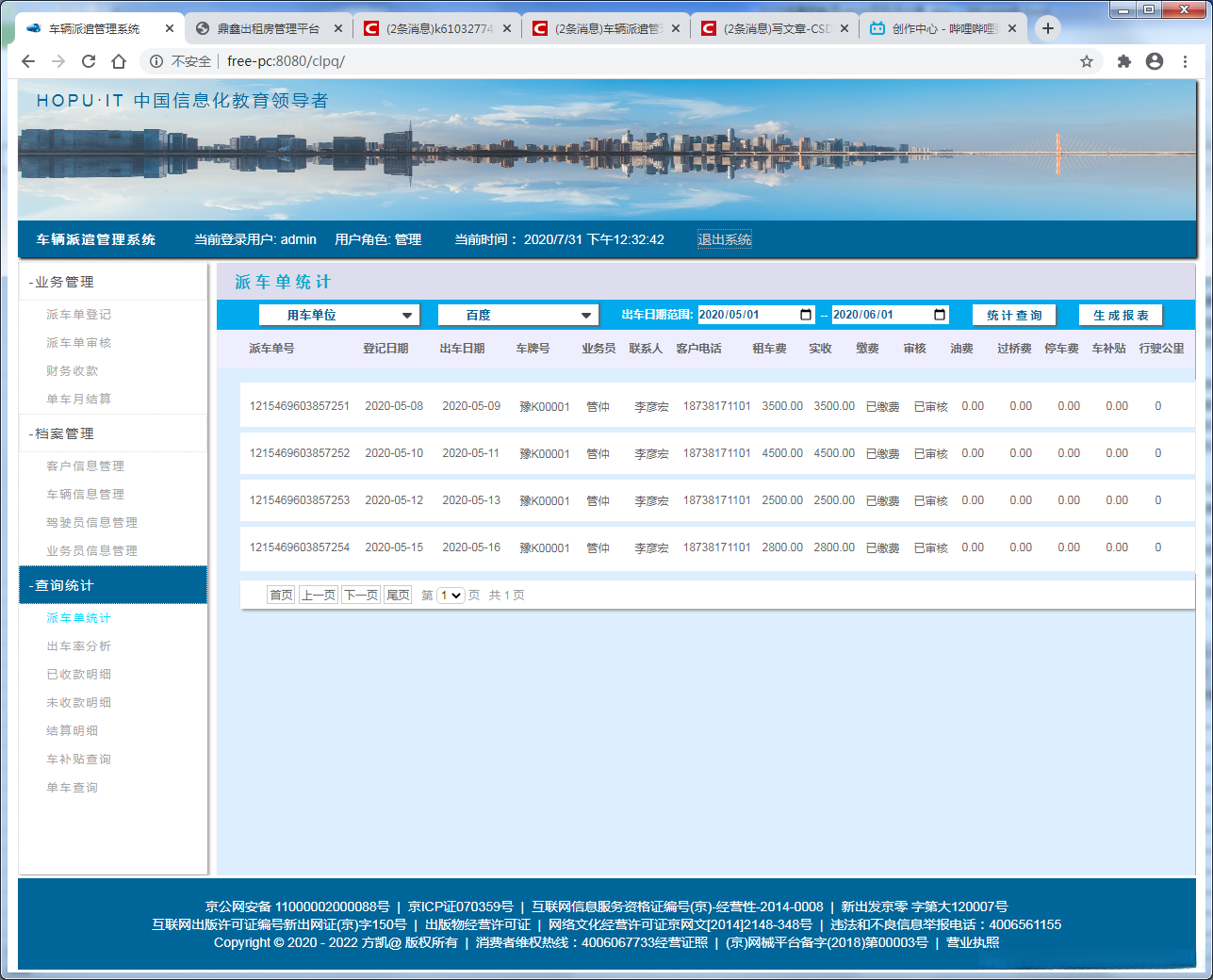 根据用车单位、车辆车牌号以及驾驶员姓名等信息,并结合业务员负责的相关数据进行查询统计,在指定出车日期范围内汇总派车单的各项详细信息,并形成相应的清单文档