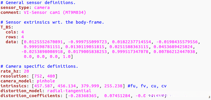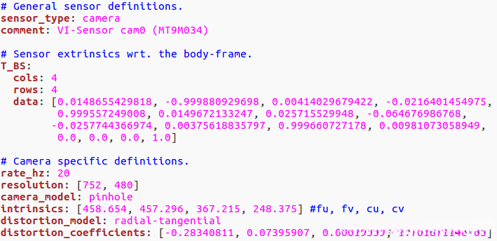 在每个传感器文件夹中配备一个yaml配置文件来记录该传感器相对于Body坐标的变换信息,并包含其内部参数。