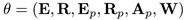分别是E, 实体嵌入; R, 关系嵌入; E_p, 实体映射向量; R_p, 关系映射向量; A_p, 属性映射向量; W, 神经网络参数
