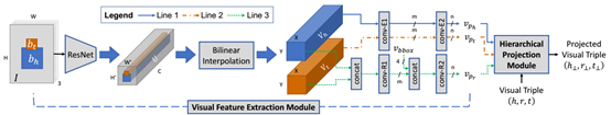 scene graph与 knowledge graph之间存在一个显著的区别在于,在 scene graph中所存在的三元组并非总是有效的。例如(person, stand on, ground)这样的三元组在 scene graph中并不总是成立。这是因为这二者之间的联系紧密依赖于具体的图像内容。因此,在构建映射关系时需要考虑 head、tail 和 relation如何动态对应到 visual space 中的不同区域。具体来说,则需要构建三个动态变化的映射矩阵来实现这一过程