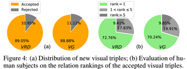 作者首先利用模型补充了原有数据集中缺失的新三元组,并紧接着使用该模型对这些新增的三元组进行了测试。结果显示其中许多被模型所认可。随后为了验证这些被 model 所认可的关系的真实有效性, 又采集了 200 张图片样本, 并针对每一新增的三元组对, 让实验人员在不晓得该 model 判断结果的前提下, 给出他们认为这两个物体间可能存在的 top-5 关系选项。通过这种方法, 发现 model 输出的相关信息中约有 85% 的内容位于 top-1 的位置。