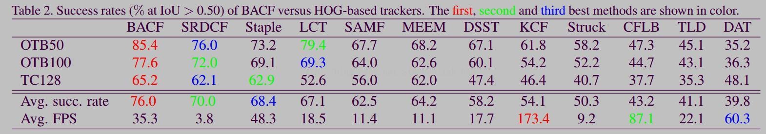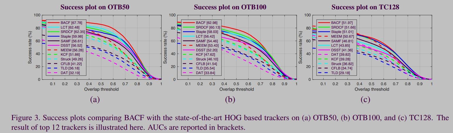 4:在BACF实验中,结合了基于HOG特征、基于深度特征以及基于深度学习的不同追踪器进行了比较分析。随后展示了结果图(其中OTB50应为OTB2013),其余细节建议进一步阅读论文。