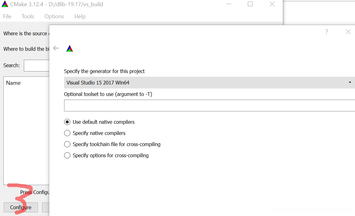 3.点击Configure,在弹出的框中选择Visual Studio15 2017 Win64