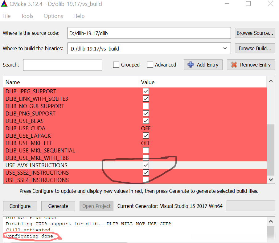 4.过一段时间,显示Configuring done, 勾选编译项AVX加速,这个在只有cpu的电脑上可以优化性能
