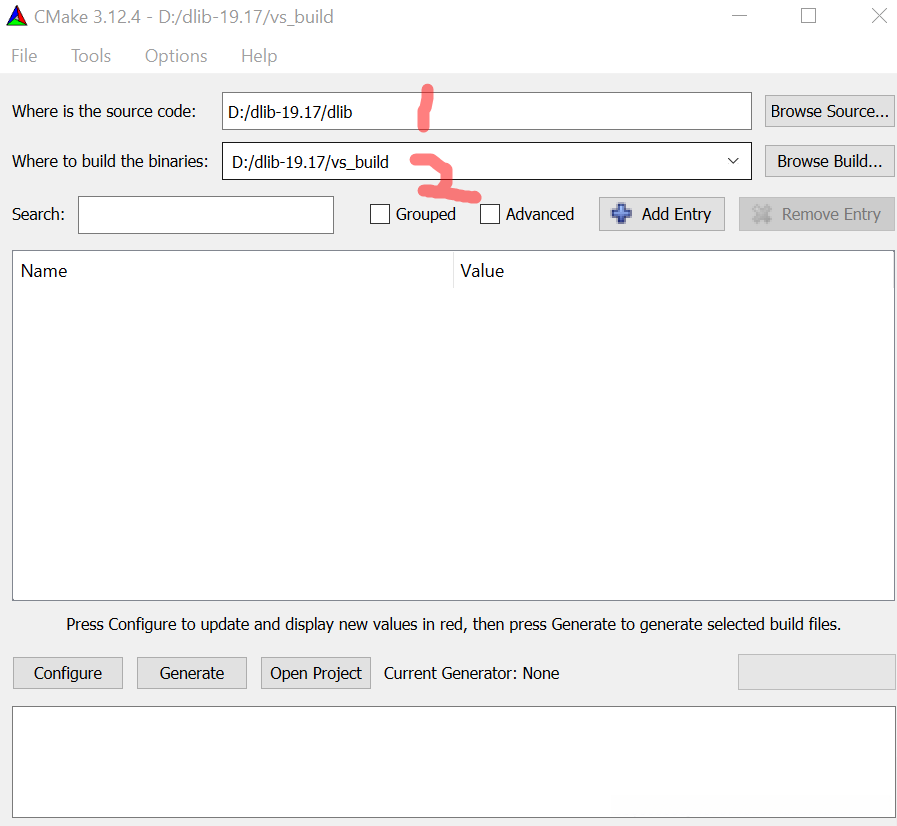 2.打开Cmake,在第1处填写dlib-19.17/dlib的路径