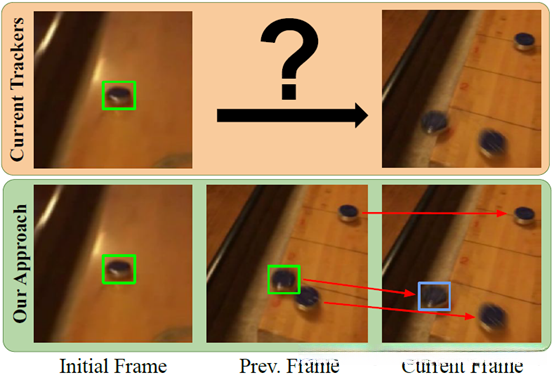与之相比,在跟踪的时候人们利用更为丰富的提示集。我们对场景有全面的了解,考虑的不仅仅是目标外观,还连续考虑场景中的其他物体。这样的信息对目标定位是非常有帮助的,比如有干扰物的杂乱场景,或当目标经历了快速外观变化时。考虑图1中的例子。仅给定初始目标外观,由于干扰物体的出现,很难定位目标。然而,如果我们利用之前的帧,我们可以很简单的检测到干扰物体的存在。接下来,这些知识就可以被传递到下一帧中,从而更可靠的定位目标。尽管目前的方法利用上一帧更新了外观模型,它不能捕捉场景中其他物体的位置和特性。