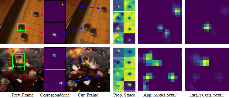 图3 用于跟踪的中间表达的可视化结果。前一帧(第一列)中的绿色框表示要跟踪的目标。对于当前帧(第三列)中的每个位置,我们绘制了与上一帧(第二列)中标记区域的关联。利用估计关联传播到当前帧中的状态在第四列中按通道绘制。由于干扰物的存在,外观模型分数(第五列)不能准确的定位目标。与之相比,我们的方法能解决这些场景,并利用传播的场景信息来提供鲁棒的目标置信度分数(最后一列)。