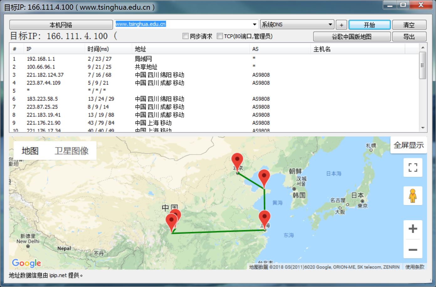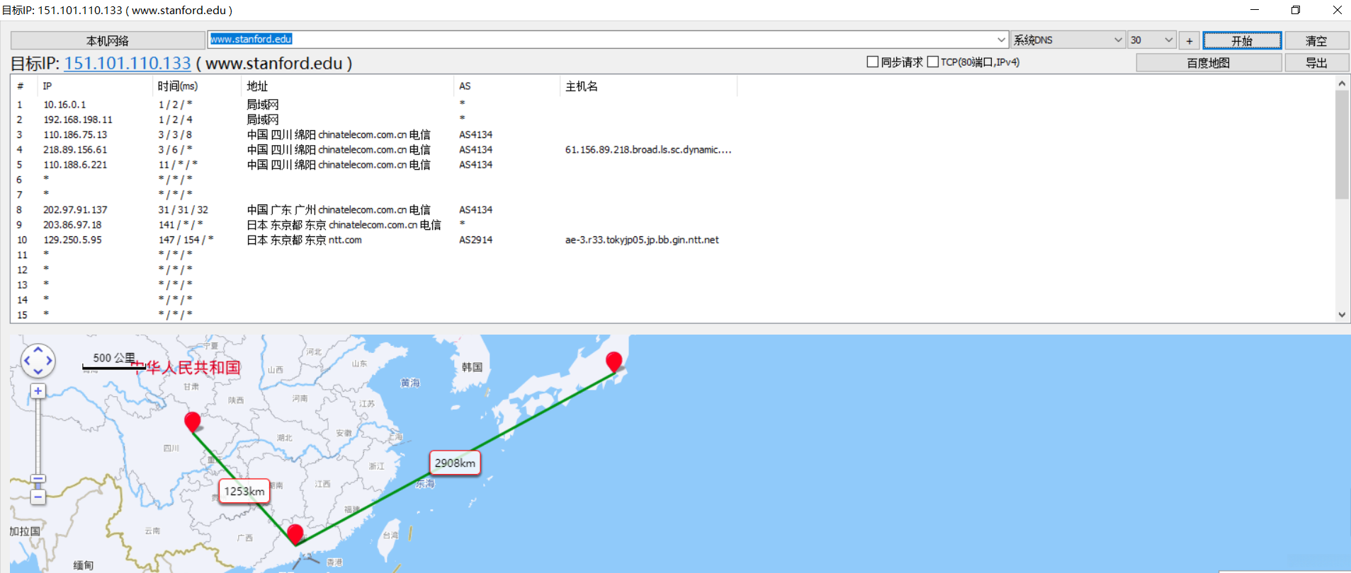 在besttrace中,将目标地址字段设置为斯坦福大学的域名www.stanford.edu后,对从你的主机到斯坦福大学网站的路径进行详细分析,可以观察到中间经过哪些城市的路由器。