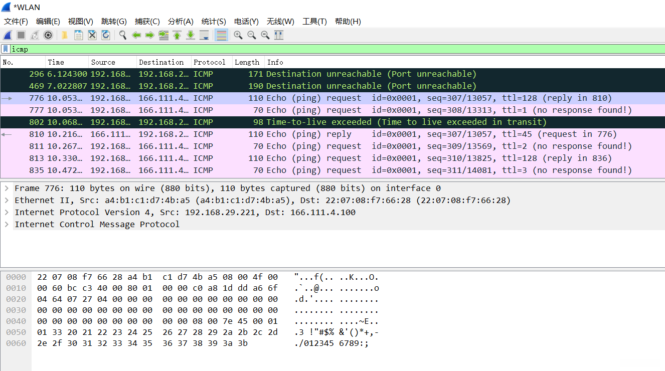 在Wireshark窗口中,设置滤波器参数为"icmp",开始数据包捕获。随后,配置路由跟踪功能,将目标地址设为www.tsinghua.edu.cn,执行路由路径的实时跟踪分析,最终呈现如下的软件界面: