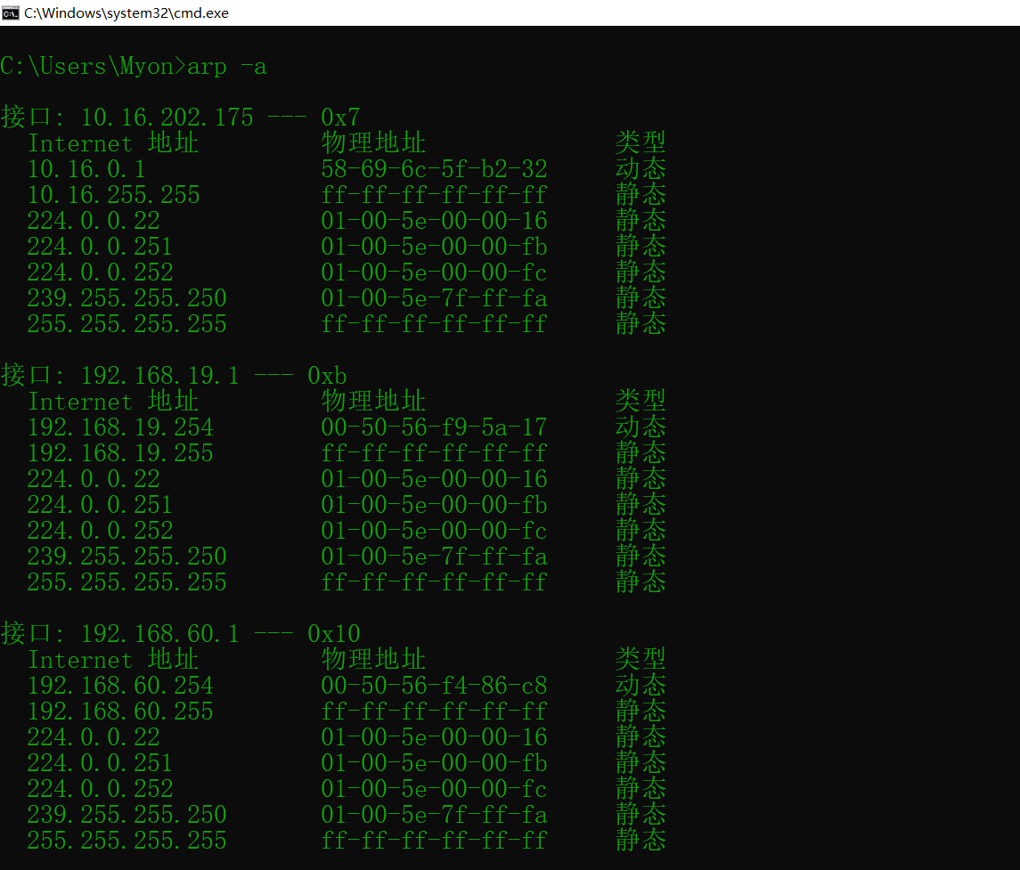 通过MS-DOS命令执行arp -a命令,可以查看主机上的ARP缓存内容。请记录下你主机的ARP缓存内容。